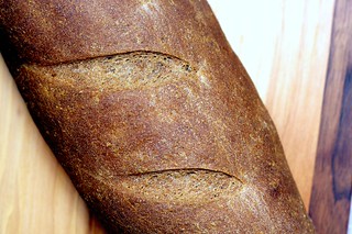 6. Sometime later (with a long first rise, a short second rise is fine, but a long one is fine, too) punch the dough down, give it a final kneading, shape into a baguette* (see my notes below), slash the top with four diagonal cuts, brush wtih water and let proof for a few minutes (it was 30 minutes, in our case). However, if you haven’t the time, it can go straight into the oven.